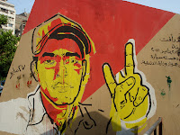 The ongoing revolution--a battle between the regime and the corporations they serve on the one hand, and ordinary Egyptians on the other--is reflected on the walls of Cairo over the memory of those who died in the uprising. A mural commemorating the martyr Islam Raafat was erased by the government, prompting outrage over censorship  and a remake of the mural (the photo to the right is the second version).
