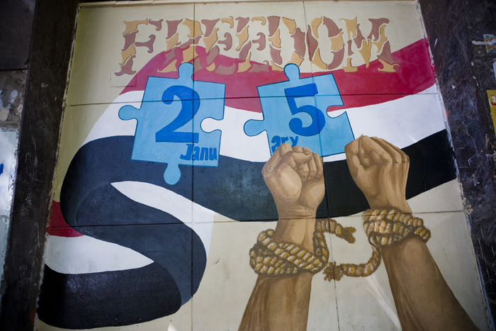There is also more direct celebrations, like this one in Tahrir Square: "Enjoy the revolution". On the left hand side in faint letters is another message, "long live freedom". This graffiti is not only a celebration but an act of ongoing resistance. As street artist Ganzeer explained, "Creating graffiti involves taking ownership of the streets, just like we did during the uprising. And so of course it's political, and illegal." The wall has also become a place to mobilize for further protests continuing the demands of revolution: it includes posters mobilizing for May Day demonstration for workers rights, and rallies in solidarity with Palestine.
